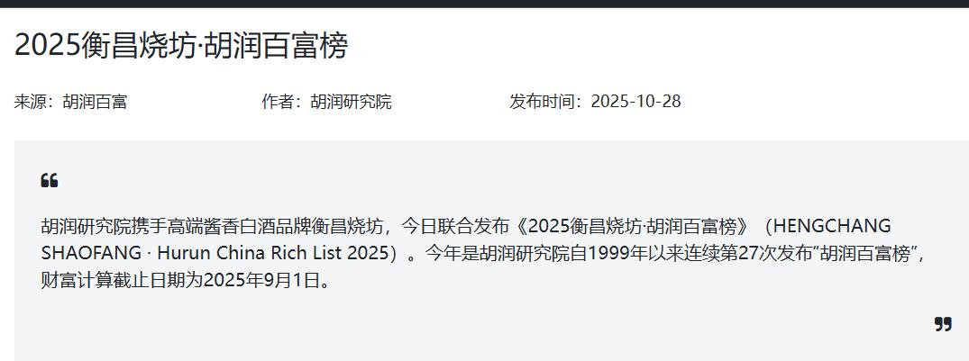 暗流涌動的股市,觸發(fā)了美妝行業(yè)的財富洗牌。10月28日,胡潤百富官網(wǎng)揭曉了2025胡潤百富榜,這是該榜單的第27次發(fā)布,財富統(tǒng)計時間截至2025年9月1日。
