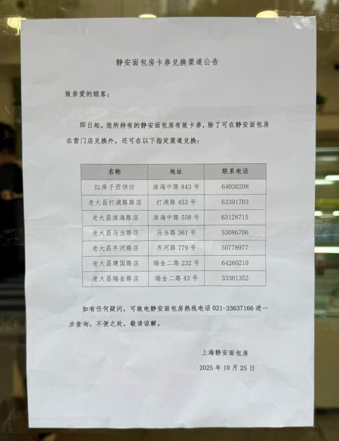 針對(duì)消費(fèi)者手中的儲(chǔ)值卡,靜安面包房于10月25日深夜發(fā)布公告:有效卡券除可在在營門店兌換外,還能在紅房子西餅坊、老大昌等7家合作品牌門店使用。這份深夜通告,為38年的烘焙傳奇畫上了略顯倉促的句號(hào)。