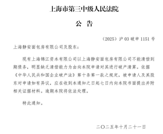 更讓人震驚的是,2025年10月21日,上海市第三中級(jí)人民法院公告顯示:上海錦江資本有限公司已申請(qǐng)對(duì)靜安面包房進(jìn)行破產(chǎn)清算,這意味著品牌命運(yùn)難以逆轉(zhuǎn)。