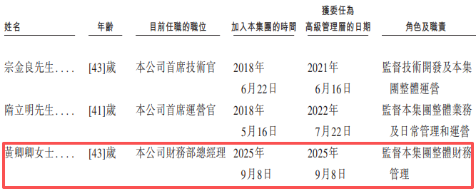 黃卿卿女士,43歲,為公司財務部總經理。2025年9月8日加入公司并獲委任該職位,此后一直擔任該職,主要負責監(jiān)督集團整體財務管理。