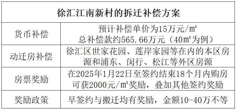 假設(shè)一個(gè)擁有江南新村40㎡房產(chǎn)的動(dòng)遷戶,拿到約565萬貨幣補(bǔ)償后,若近兩年有買房計(jì)劃,選擇在徐匯購買一套二手房或新建商品房,原被征收房屋面積約為80㎡,那么他將得到16萬房票獎(jiǎng)勵(lì),過期無效。江南新村總戶數(shù)為1187戶,部分居民已提前購房并享受補(bǔ)貼。
