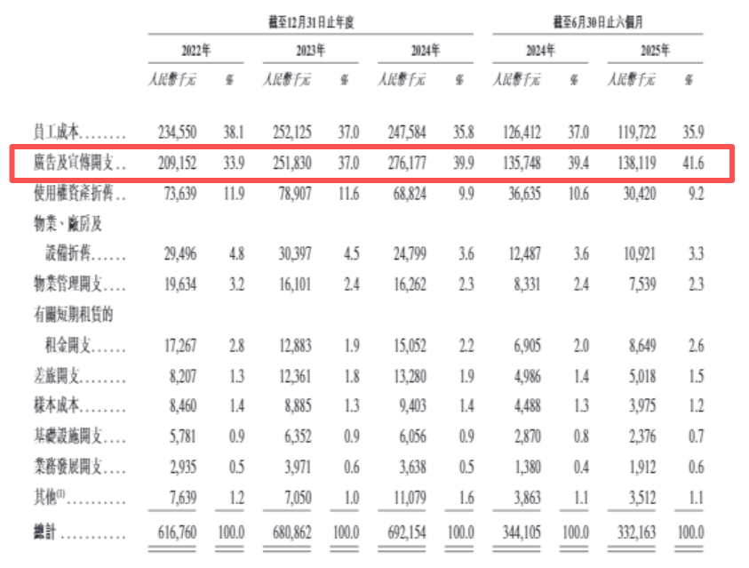 為擴大市場份額,八馬茶業(yè)在營銷上投入巨大。2022 - 2025年上半年,銷售及營銷開支分別為6.17億元、6.81億元、6.92億元、3.32億元,占營收比例分別為33.9%、32.1%、32.3%、31.2%。其中,廣告及宣傳開支累計約8.75億元,且對廣告依賴度不斷提升,占比從2022年的33.9%提升至2025年上半年的41.6%。