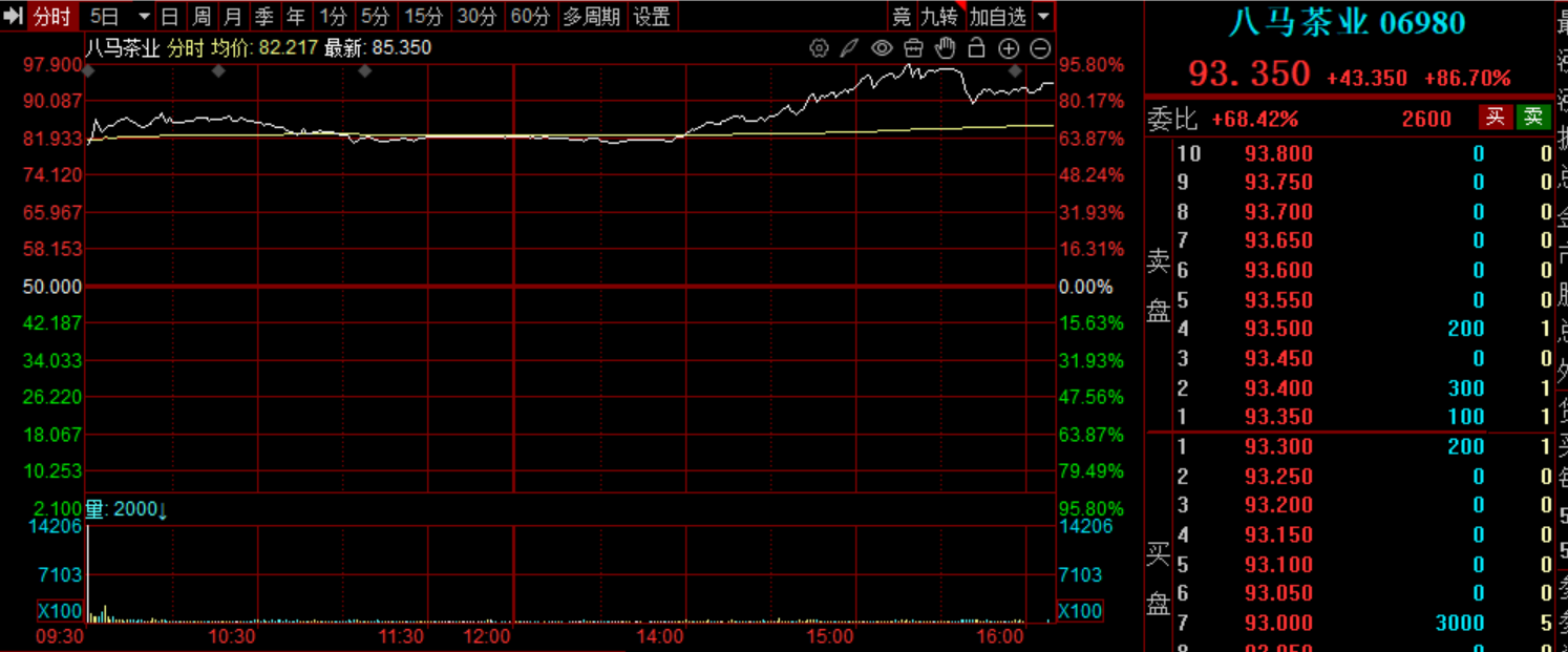 10月28日上午九時,八馬茶業(yè)(06980.HK)正式在港交所掛牌交易。其股價開盤便大幅上漲,漲幅超60%,截至收盤,股價達到93.35港元/股,漲幅高達86.70%。