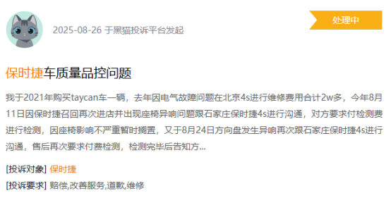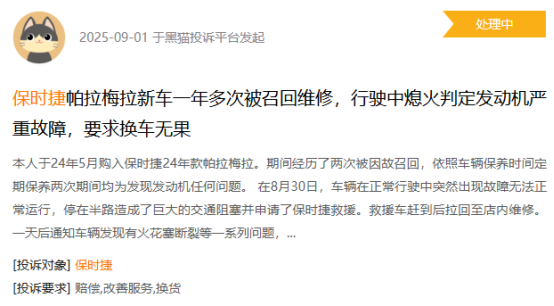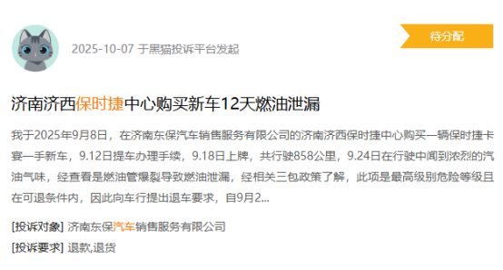 此外,不少消費者投訴保時捷汽車品控問題。有車主稱帕拉梅拉新車一年多次召回維修,行駛中熄火發(fā)動機(jī)故障;還有車主稱新車12天出現(xiàn)燃油泄漏問題。