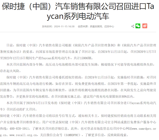 實際上,此前保時捷多次發(fā)布電池召回公告。最近一次召回顯示,召回范圍內(nèi)的Taycan高壓動力電池模組可能短路,極端情況會熱失控起火。