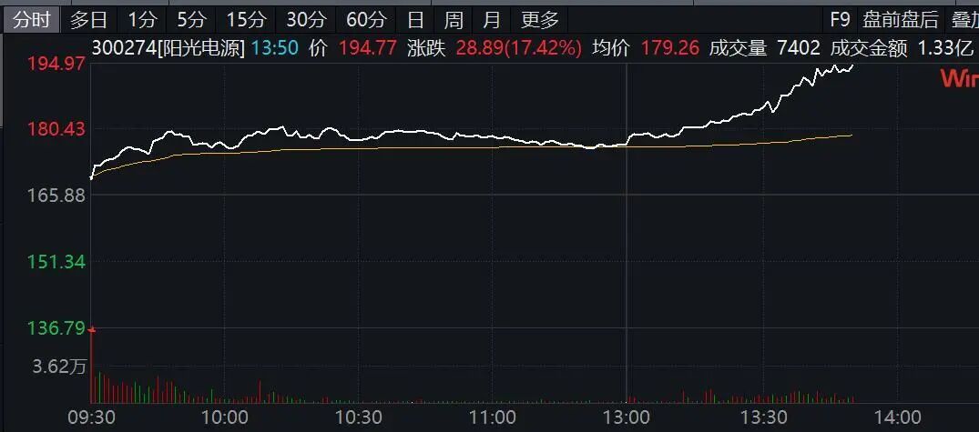 午后股市異動(dòng):300274陽(yáng)光電源猛拉漲超17%,市值突破4000億