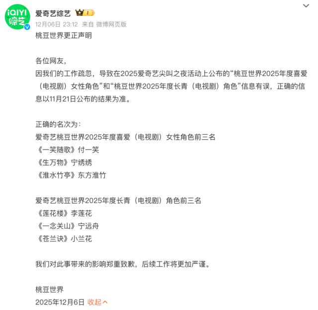 愛(ài)奇藝方面在聲明中對(duì)錯(cuò)誤帶來(lái)的影響表達(dá)了鄭重歉意,并承諾后續(xù)工作會(huì)更加嚴(yán)謹(jǐn)。該聲明落款為“桃豆世界”,日期為2025年12月6日。