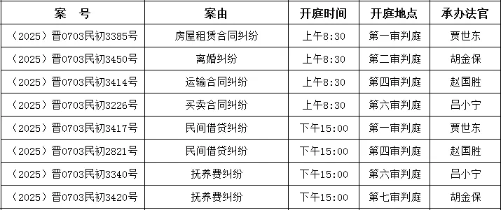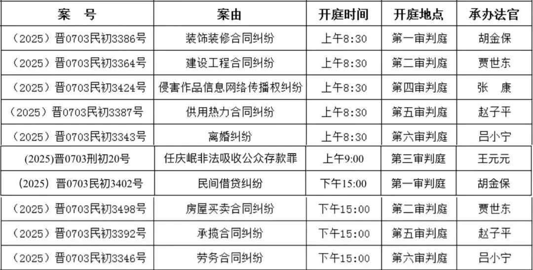 小編為大家整理了2025年12月8日到12月12日期間本院開庭審理的案件信息。如果其中有您涉及的案件,請務(wù)必準(zhǔn)時到庭參與開庭;若沒有您的案件,感興趣的朋友也可攜帶身份證前來旁聽。除法律規(guī)定的涉及國家秘密、商業(yè)秘密、個人隱私以及當(dāng)事人申請不公開審理的案件外,其余案件均公開審理。以下開庭信息為提前整理所得,由于案件審理過程中可能出現(xiàn)調(diào)解、撤訴、延期審理等特殊情況,開庭時間有時會進(jìn)行排期調(diào)整,屆時若與實際開庭時間、地點(diǎn)不符,以實際情況為準(zhǔn)。