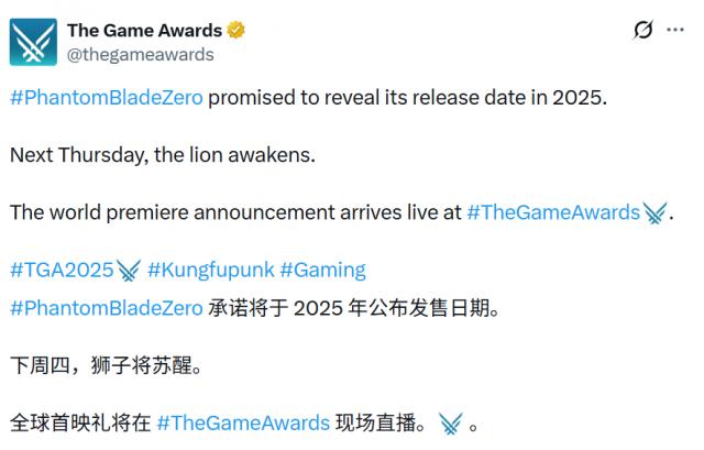 靈游坊先是轉(zhuǎn)發(fā)了TGA官方的預(yù)熱視頻,配文提到“《影之刃零》承諾2025年內(nèi)公布發(fā)售日期、下周四雄獅覺(jué)醒”——TGA 2025的舉辦時(shí)間正是12月11日(周四),同時(shí)官方還透露游戲發(fā)售日期已敲定,只差正式公布。