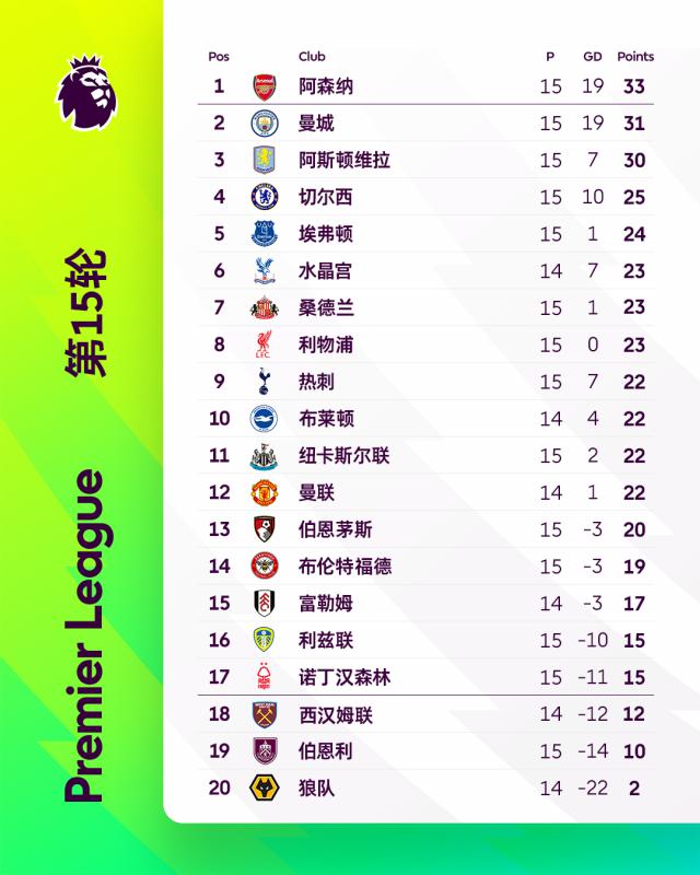 英超聯(lián)賽第15輪的7場較量已全部結(jié)束,本輪賽事亮點紛呈:阿斯頓維拉在補時階段絕殺阿森納,目前積分落后阿森納3分;曼城則以3-0的比分大勝桑德蘭,積分差距縮小至僅落后阿森納2分;切爾西與伯恩茅斯戰(zhàn)成平局,暫時位列積分榜第4位;利物浦在領(lǐng)先情況下被利茲聯(lián)絕平,排名下滑至第8位。