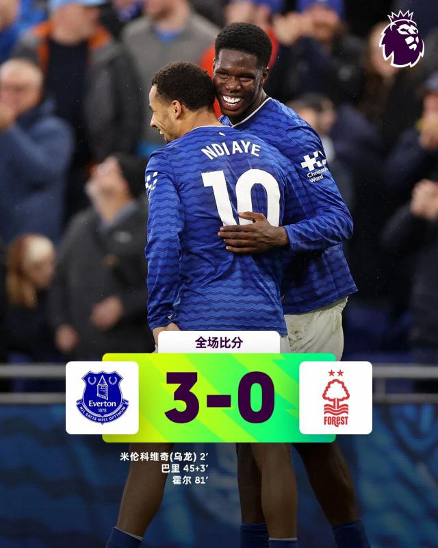 最終,埃弗頓3-0擊敗諾丁漢森林。