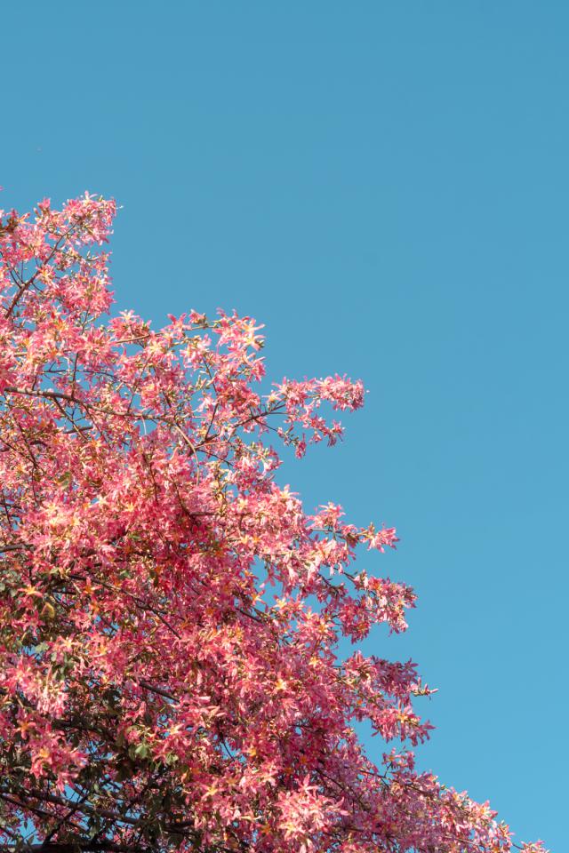 遠看如一把巨型粉色花傘,藍天映襯下,純粹、熱烈、治愈。樹下常有人靜靜仰望或舉起手機記錄,獨享這片刻美好。