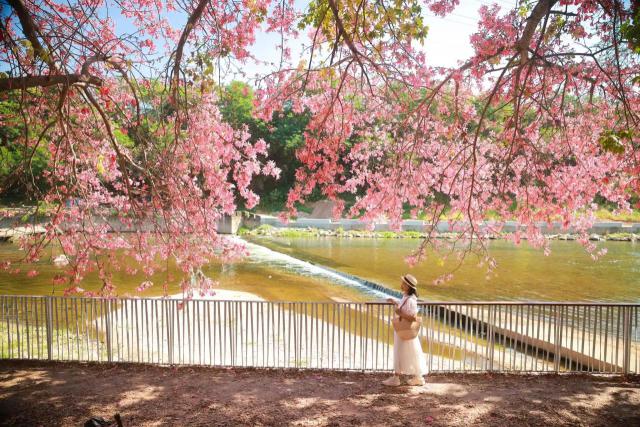 沿著親水步道漫行,一公里的異木棉整齊列隊,粉白花朵壓滿枝頭,枝椏溫柔探向水面。
