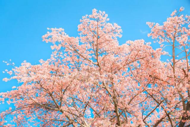 站在樹下仰望,花朵簇擁如云,陽光透過縫隙灑下,瞬間穿越進動漫場景。