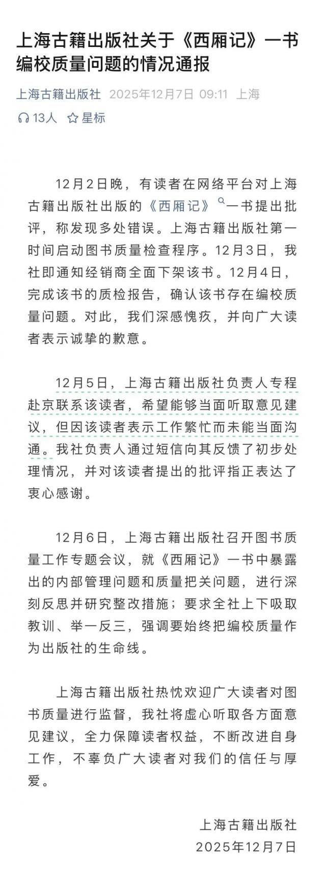 12月2日晚,有讀者在網(wǎng)絡(luò)平臺對上海古籍出版社出版的《西廂記》提出批評,指出書中存在多處錯誤。上海古籍出版社迅速啟動圖書質(zhì)量檢查流程。12月3日,出版社通知經(jīng)銷商對該書全面下架。12月4日,完成該書質(zhì)檢報告,明確存在編校質(zhì)量問題。對此,出版社深感愧疚,向廣大讀者致以誠摯歉意。