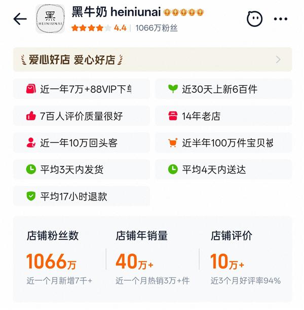 資料顯示,“黑牛奶heiniunai”已深耕電商領(lǐng)域16年,積累了超1000萬粉絲,店鋪等級(jí)達(dá)5個(gè)金冠,曾創(chuàng)下年銷量超40萬件的成績(jī),僅最近一個(gè)月就熱銷3萬多件。