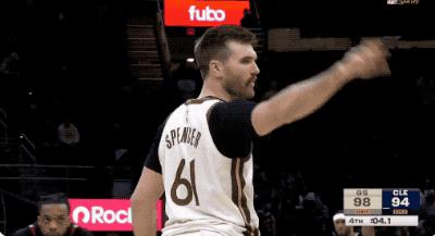 今日斯潘塞表現(xiàn)出色,替補(bǔ)席上穿著便服的庫里也為他興奮不已。