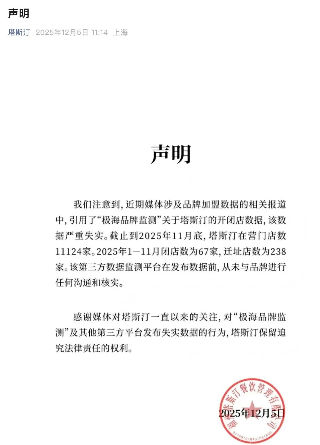 聲明指出,該第三方平臺所提供的塔斯汀開閉店數(shù)據(jù)嚴重失實,且在發(fā)布數(shù)據(jù)前未與品牌方進行任何溝通核實。據(jù)塔斯汀官方披露,截至2025年11月底,品牌在營門店數(shù)量達11124家;2025年1月至11月期間,實際閉店數(shù)僅為67家,另有238家為遷址門店,并非真實關(guān)店。