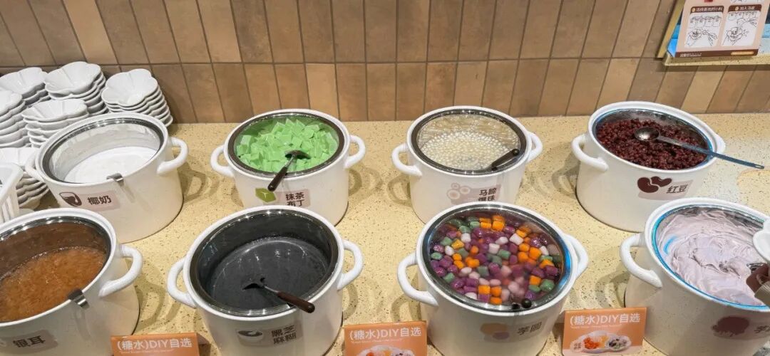 店內(nèi)設置優(yōu)優(yōu)烤板栗、高山烤蜜薯、潮汕甜湯、半熟芝士等流行甜點小吃,其中潮汕甜湯提供椰奶、抹茶布丁、芋泥等8個品種,支持顧客DIY搭配。