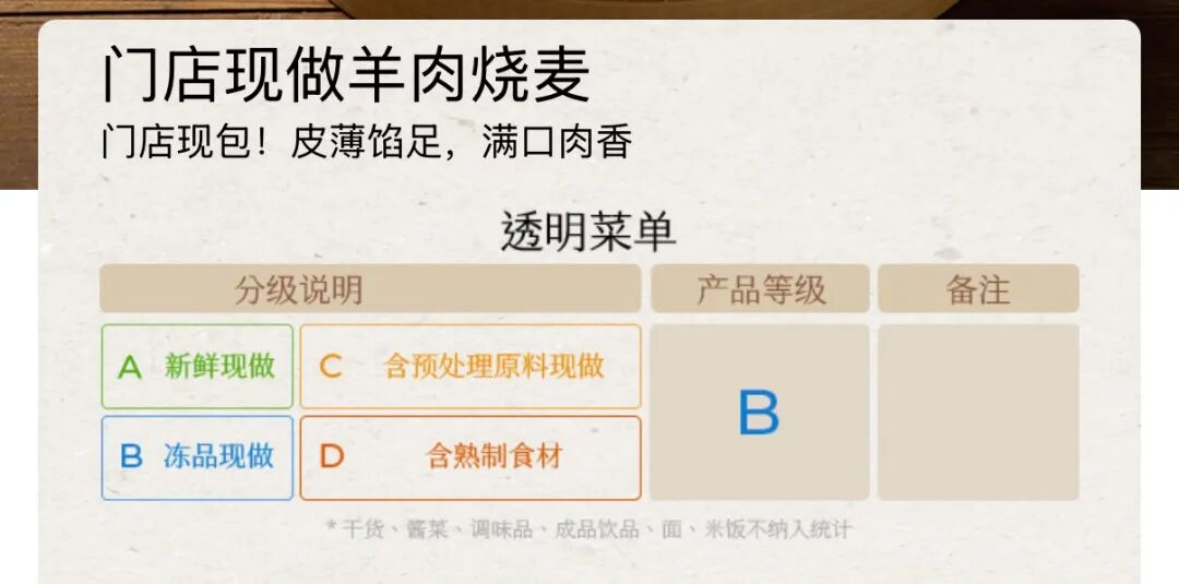 菜單將菜品嚴(yán)格分為“新鮮現(xiàn)做、凍品現(xiàn)做、含預(yù)處理原料現(xiàn)做、含熟制食材”四個(gè)類別(注:干貨、醬菜、調(diào)味品、成品飲料及米面主食不納入統(tǒng)計(jì))。
