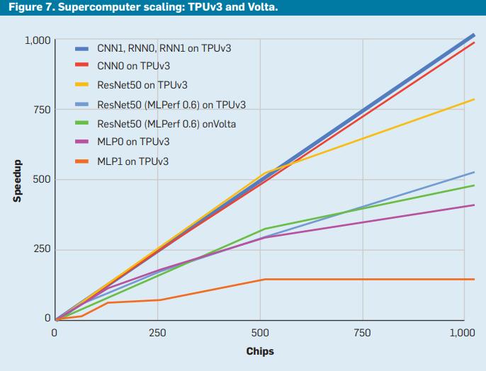 隨著 TPUv3 規(guī)模增加,模型訓(xùn)練速度提升