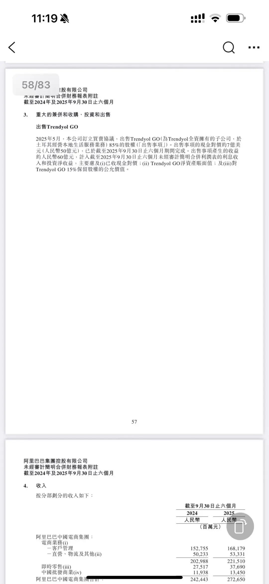 其今日發(fā)布的中報(bào)顯示,今年5月,阿里訂立買賣協(xié)議,向全球出行巨頭Uber出售Trendyol GO 85%的股權(quán),以約7億美元(折合人民幣50億元)的現(xiàn)金對(duì)價(jià)完成交易,出售事項(xiàng)產(chǎn)生的收益約60億元,該筆收益已計(jì)入2025年上半年投資凈收益。此次交易于截至2025年9月30日的六個(gè)月內(nèi)完成。