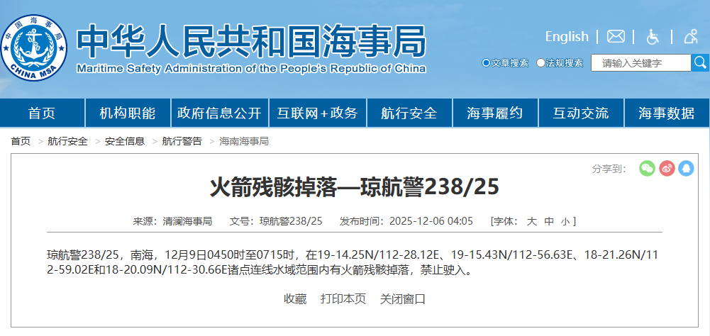 ●據(jù)中國(guó)海事局網(wǎng)站消息,清瀾海事局發(fā)布航行警告,12月9日4時(shí)50分至7時(shí)15分,南海部分水域因有火箭殘骸掉落,禁止駛?cè)搿#ㄖ袊?guó)海事局網(wǎng)站)