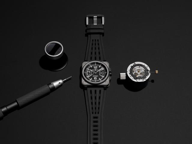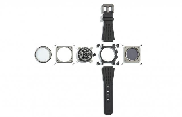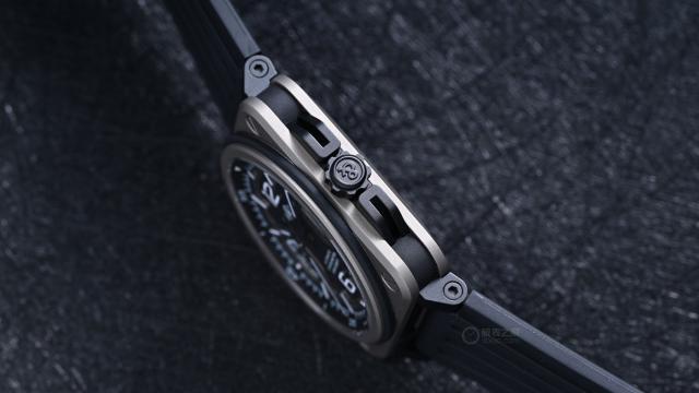 黑鈦表殼延續(xù)BR-X5的“三明治”結(jié)構(gòu):表殼上下部分之間夾著圓形表盤與機(jī)芯盒,四角各設(shè)一根支柱,四顆螺絲從正面貫穿,將表圈、表殼與底蓋鎖緊。這種設(shè)計(jì)不僅利于控制重量,更為不同材質(zhì)與顏色的組合提供可能。