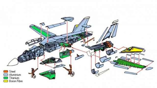 美國(guó)F-14戰(zhàn)機(jī)材料分布(綠色部分為鈦金屬)(圖源網(wǎng)絡(luò))