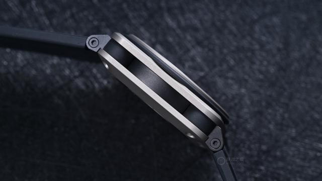 側(cè)面可見(jiàn)典型的柏萊士旋入式表冠,搭配棱角分明的表冠護(hù)肩,黑鈦款護(hù)肩采用黑色DLC涂層鈦金屬(藍(lán)色款為鋼制)。搭配同色系黑色鏤空橡膠表帶,上手輕盈且貼合度極佳。