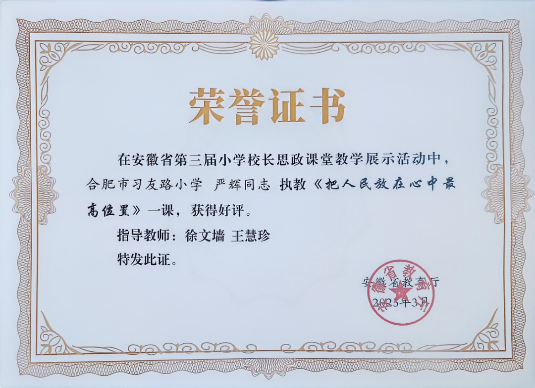 2025年,合肥市習友路小學校長嚴輝憑借《把人民放在心中最高位置》主題思政課,在合肥市小學校長思政課堂教學競賽中脫穎而出,作為合肥市唯一代表晉級省級展示。