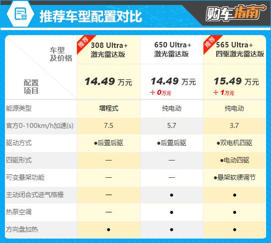 從配置綜合來(lái)看,除了首推的增程版車型外,純電版中推薦565 Ultra+四驅(qū)激光雷達(dá)版。這款車型對(duì)比650 Ultra+激光雷達(dá)版,新增了前置單電機(jī),升級(jí)為雙電機(jī)四驅(qū)系統(tǒng),官方百公里加速僅3.7秒,在同級(jí)別車型中表現(xiàn)出色,適合追求運(yùn)動(dòng)性能的消費(fèi)者。同時(shí),該車型還增加了懸架軟硬調(diào)節(jié)功能,進(jìn)一步強(qiáng)化了運(yùn)動(dòng)屬性,而售價(jià)僅比后者高1萬(wàn)元,性價(jià)比優(yōu)勢(shì)顯著。