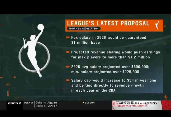 在上周最新提案中,聯(lián)盟以大幅漲薪為核心:標(biāo)準(zhǔn)頂薪100萬美元,通過分成機制最高可達120萬美元;平均年薪約50萬美元,最低年薪22萬美元左右。這些數(shù)字遠超當(dāng)前水平——目前WNBA底薪6.6萬美元、平均薪資10.22萬美元、頂薪24.9萬美元。