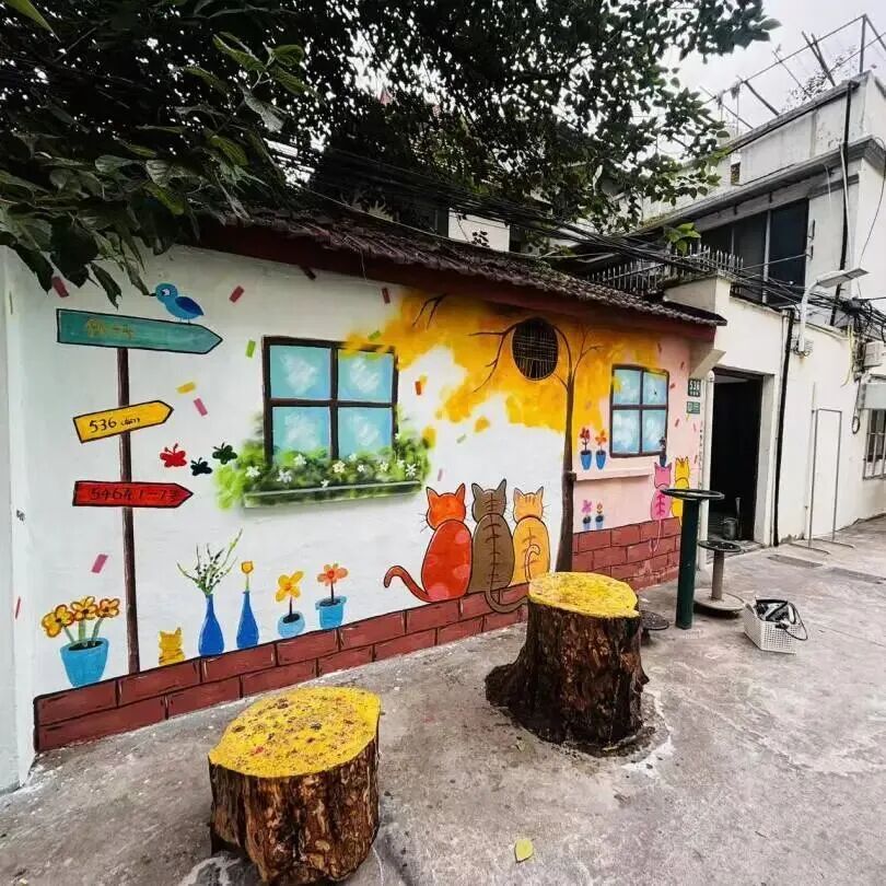 “鋸掉樹,留下樁,做成藝術(shù)品!”協(xié)商中誕生的大膽創(chuàng)意,正是共治的精髓:居民是靈感與需求來源,區(qū)綠化市容局完成枯樹鑒定、安全鋸除和病蟲害防治,藝術(shù)家貢獻(xiàn)焚燒、打磨、封樹脂等技藝。黨總支統(tǒng)籌下,專業(yè)力量凝聚,社會(huì)組織發(fā)揮橋梁作用,轄區(qū)學(xué)校學(xué)生創(chuàng)意融入,居民意見被回應(yīng),各方將枯樹重塑為充滿生命力的藝術(shù)景觀。從清運(yùn)到再造,是社會(huì)治理從“管理”到“營造”的飛躍。作品旁的墻繪,由陳鶴琴小學(xué)學(xué)生執(zhí)筆,用童趣線條定格“枯木生花”的故事。