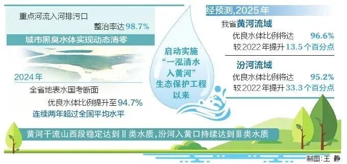 隨著一系列舉措落地,黃河流域水環(huán)境顯著改善。預測顯示,2025年山西黃河流域優(yōu)良水體比例將達96.6%,較2022年提升13.5個百分點;汾河流域優(yōu)良水體比例將達95.2%,較2022年提升33.3個百分點。