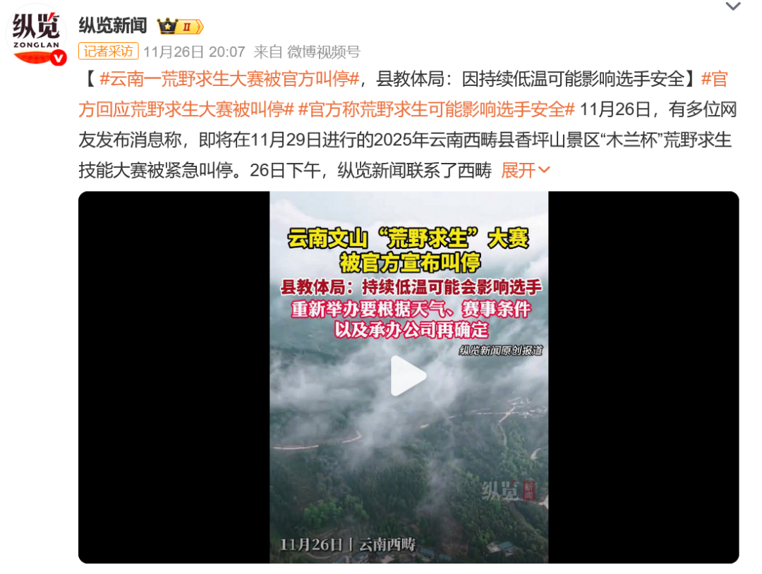 云南文山“木蘭杯”荒野求生技能大賽原定于11月29日舉辦,11月26日被緊急叫停。西疇縣教育體育局表示,因當(dāng)?shù)爻掷m(xù)低溫不利于野外生存,為保障選手安全決定暫不舉辦,后續(xù)是否重啟需重新評估天氣、籌備等條件。該賽事報名年齡限制在20至50周歲,設(shè)56個名額,冠軍獎金10萬元,截至11月5日晚已有168人報名。