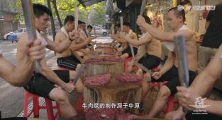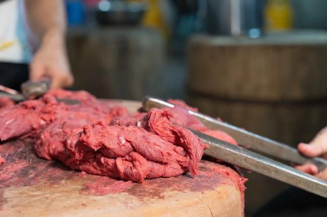 十幾位精壯小伙圍在長桌旁,桌上擺滿肉泥,他們手持七斤二兩重的鐵棍,持續(xù)敲打近一個小時,將瘦牛肉打成肉漿,再手工捏制成一顆顆令人垂涎的牛肉丸,端上餐桌與新鮮牛肉一同供食客享用。