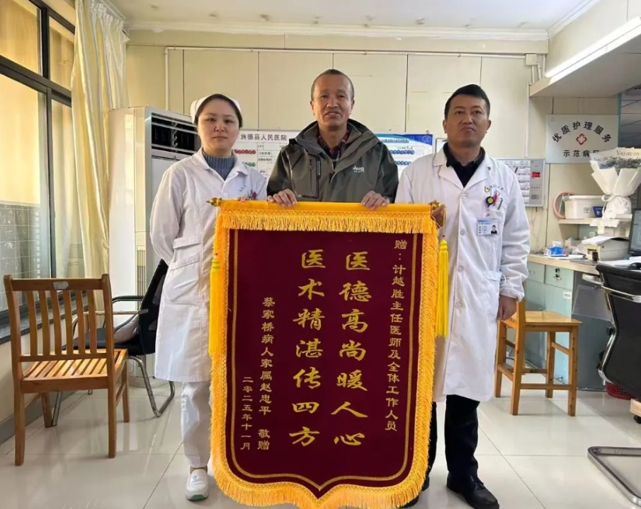 12月2日,旌德縣人民醫(yī)院神經(jīng)醫(yī)學(xué)科辦公室里暖意濃濃,患者吳奶奶的女婿特意趕來,把一面印著 “醫(yī)德高尚暖人心 醫(yī)術(shù)精湛傳四方” 的鮮紅錦旗鄭重交到科室主任計(jì)越勝手中,話語里滿是對醫(yī)護(hù)團(tuán)隊(duì)的感激,字里行間凝聚著醫(yī)患間的深厚情誼。