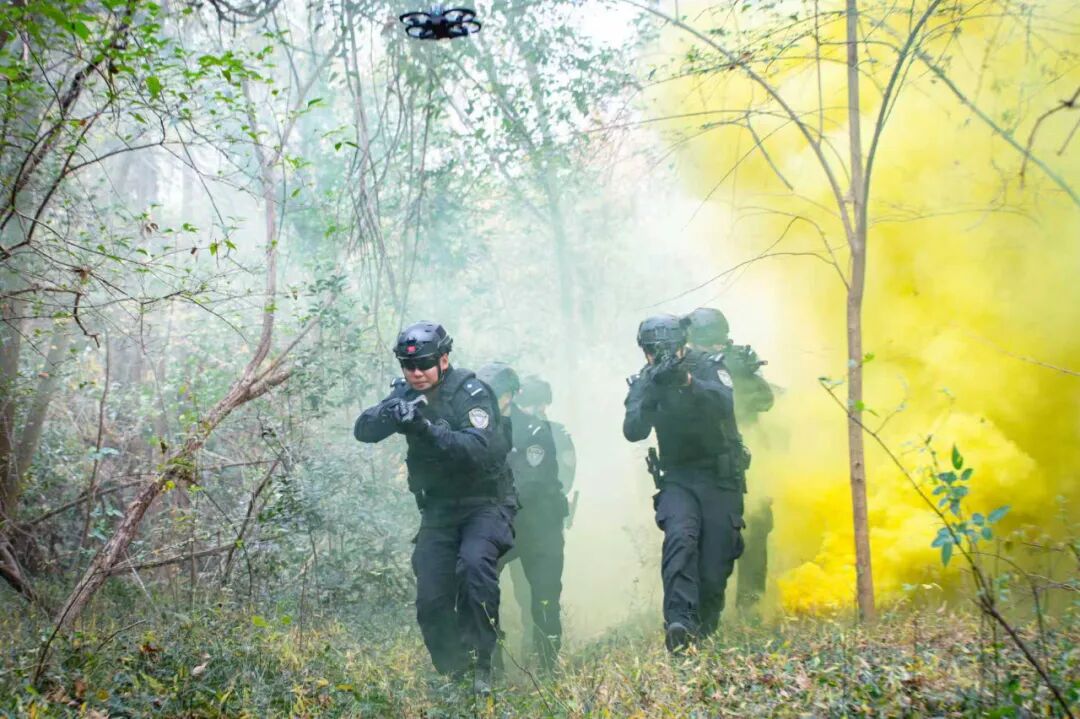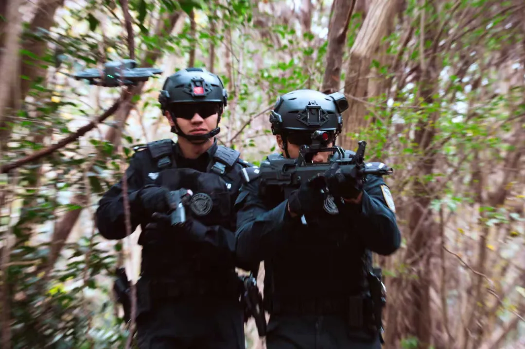 演練現(xiàn)場模擬真實(shí)野外環(huán)境的挑戰(zhàn)。在叢林與山地交織的復(fù)雜地形里,特警隊(duì)員們?nèi)蔽溲b,利用無人機(jī)和搜救犬的精準(zhǔn)配合,快速鎖定“目標(biāo)”并完成處置任務(wù)。