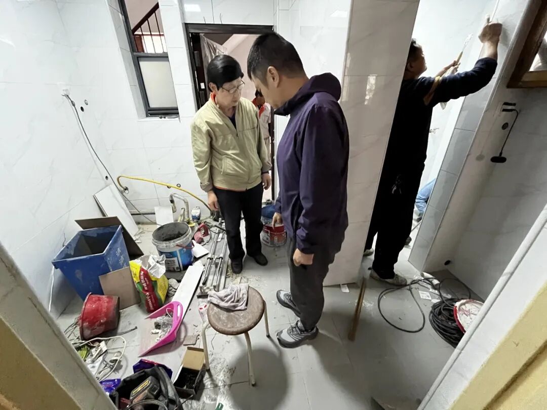 改造過程中,服務(wù)站建立了“每日巡查+家屬反饋”的機制,從裝修材料的環(huán)保性到施工噪音的控制,從施工垃圾的清運到工程進度的協(xié)調(diào),全程跟進每個環(huán)節(jié)。同時,施工團隊還根據(jù)老人的作息時間調(diào)整作業(yè)時段,避免打擾他們休息。經(jīng)過十多天的施工,三戶人家的廚衛(wèi)煥然一新:吳文昭家的衛(wèi)生間安裝了起身扶手和淋浴坐凳;周良文家的廚房臺面調(diào)整到了舒適高度,做飯切菜不用再彎腰踮腳;孫瑞英家的廚衛(wèi)換上了明亮的節(jié)能燈具,地面防滑處理讓行走更安心?!氨任覀冏约合氲倪€周到!”老人們撫摸著新設(shè)施,臉上洋溢著笑容。