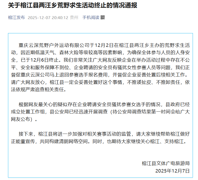 通報(bào)指出,重慶云深荒野戶外運(yùn)動有限公司于12月2日在榕江縣兩汪鄉(xiāng)主辦的荒野求生活動,因近期低溫天氣、森林火險(xiǎn)等級較高等因素影響,為確保全體參與人員的人身安全,已于12月6日終止。對于網(wǎng)友反映的企業(yè)在舉辦活動過程中存在不公平、安全和服務(wù)保障不到位、企業(yè)聘請的安全員有騷擾女性參賽人員等問題,榕江縣正督促重慶云深公司馬上退回參賽選手報(bào)名費(fèi)用,并督促企業(yè)妥善處置后續(xù)相關(guān)工作。榕江縣表示,一定會妥善處置好這個(gè)事情,不推諉扯皮、不推卸責(zé)任,依法依規(guī)嚴(yán)肅追查相關(guān)責(zé)任。