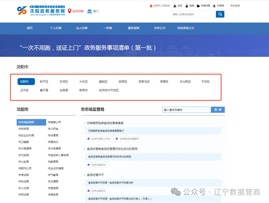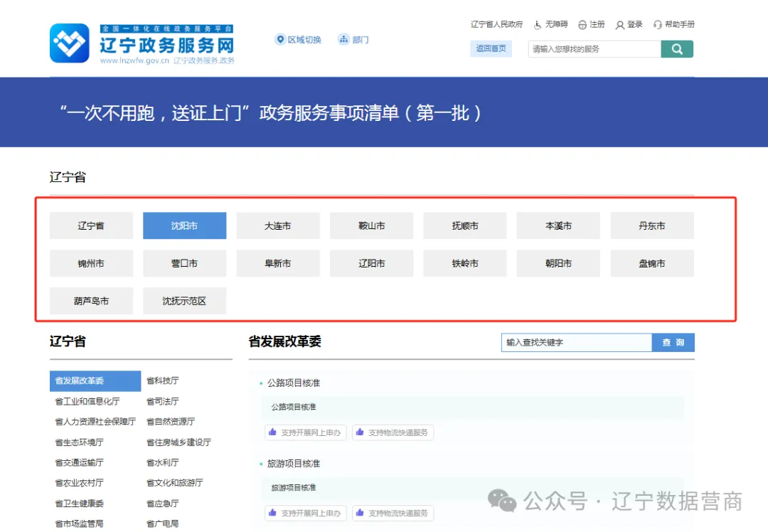 第一種途徑:登錄遼寧政務(wù)服務(wù)網(wǎng),進(jìn)入“一次不用跑,送證上門”專區(qū),查找對應(yīng)地區(qū)的可辦理事項后直接在線辦理。