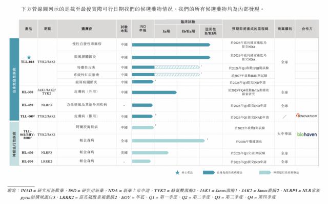 截至最后實際可行日期,公司內(nèi)部已儲備七款候選藥物,涵蓋四款臨床階段藥物與三款臨床前階段藥物。其中核心產(chǎn)品TLL-018、TLL-041及TLL-009,是全球范圍內(nèi)唯一擁有高選擇性的TYK2/JAK1抑制劑。