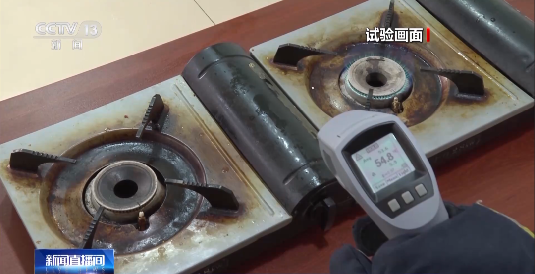 實(shí)驗(yàn)中,消防員將兩個(gè)卡式爐并排擺放,只點(diǎn)燃其中一個(gè)。不久后測量發(fā)現(xiàn),雖然只有一個(gè)點(diǎn)火,另一個(gè)未點(diǎn)火的卡式爐氣瓶溫度迅速升到50℃以上,且還在持續(xù)升高。