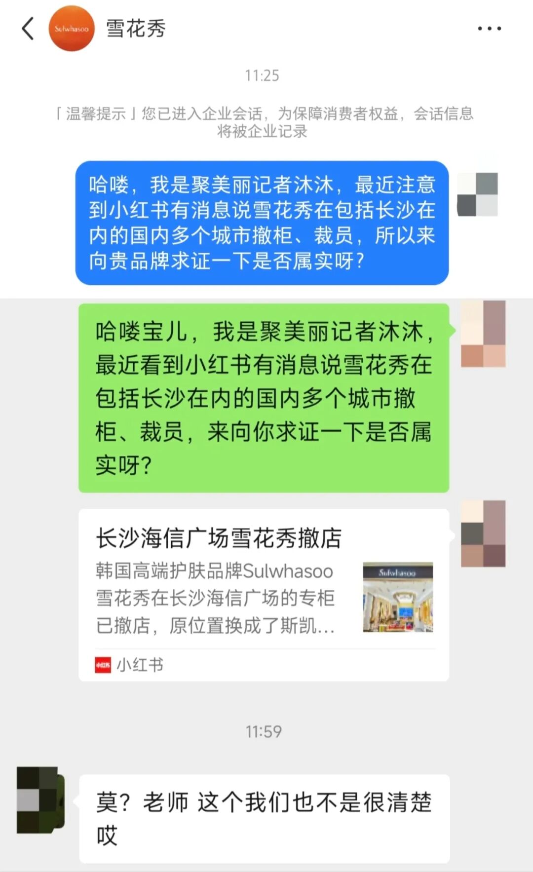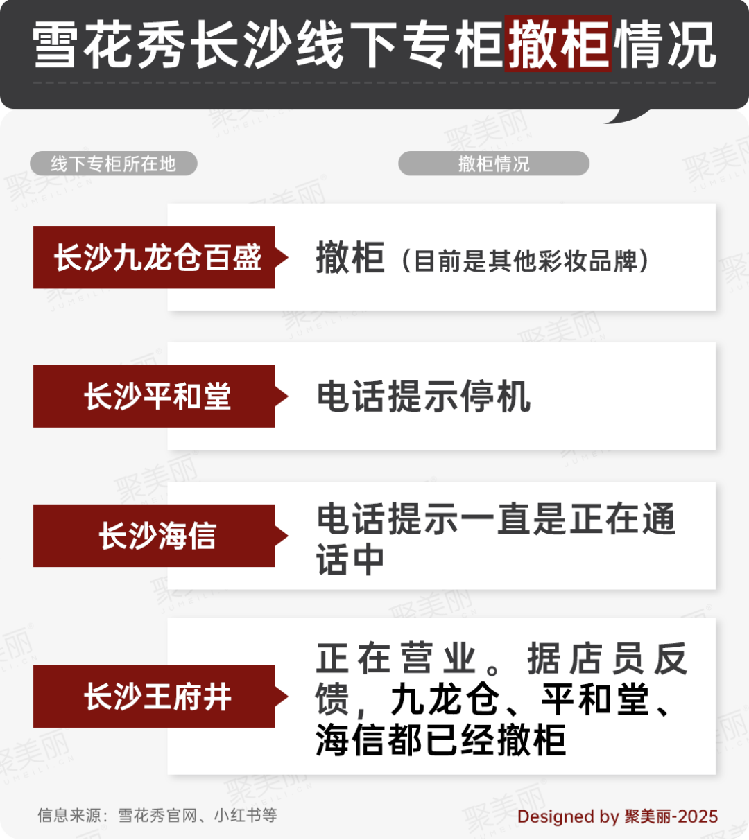 經(jīng)聚美麗記者多次確認(rèn),目前長(zhǎng)沙地區(qū)仍在營(yíng)業(yè)的雪花秀線下專柜僅有王府井百貨一家。該店店員在電話中證實(shí):“目前長(zhǎng)沙確實(shí)只有我們這一家線下專柜還在正常營(yíng)業(yè),海信廣場(chǎng)是上個(gè)月剛撤的,其他幾家其實(shí)幾年前就陸續(xù)撤了。”
