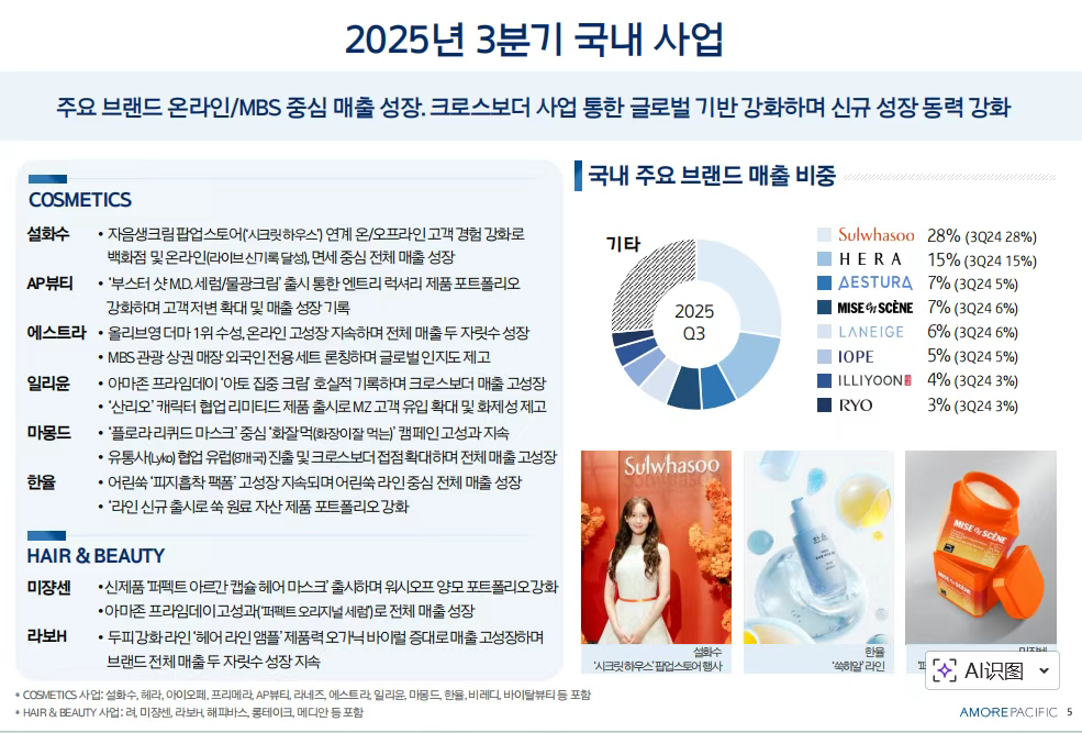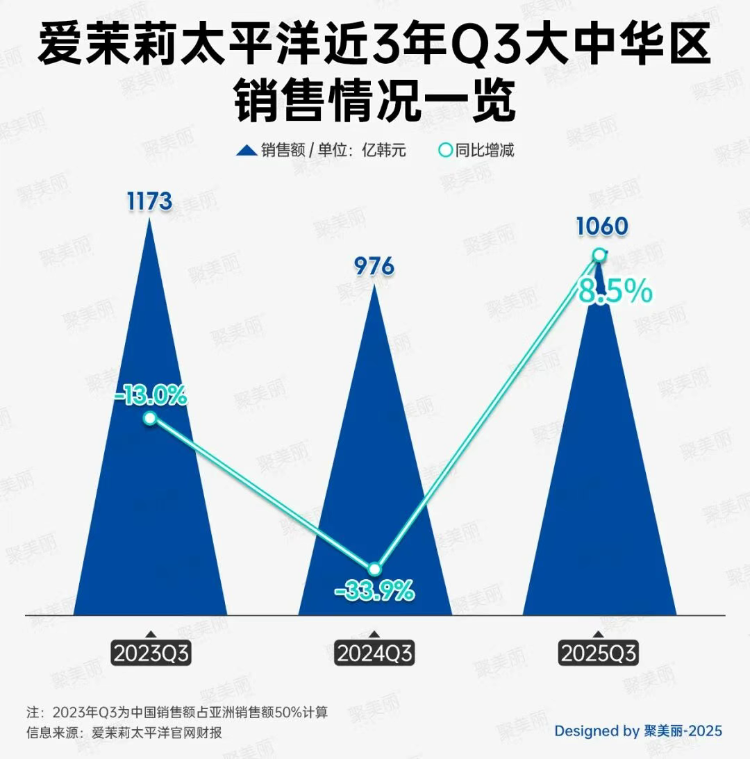 這一系列“撤退”動(dòng)作的背后,是韓妝巨頭在華業(yè)績(jī)的持續(xù)承壓與戰(zhàn)略調(diào)整。以愛(ài)茉莉太平洋為例,其近三年第三季度在華銷售額增速波動(dòng)較大,2023年為13.0%的負(fù)增長(zhǎng),2024年大幅下滑至33.9%的負(fù)增長(zhǎng)。盡管2025年第三季度憑借高端線拉動(dòng)錄得8.5%的增長(zhǎng),但整體復(fù)蘇根基并不穩(wěn)固。