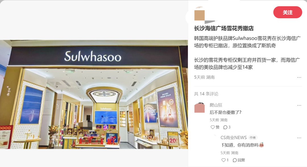雪花秀長(zhǎng)沙專柜大幅收縮 高端韓妝在華線下渠道遇冷