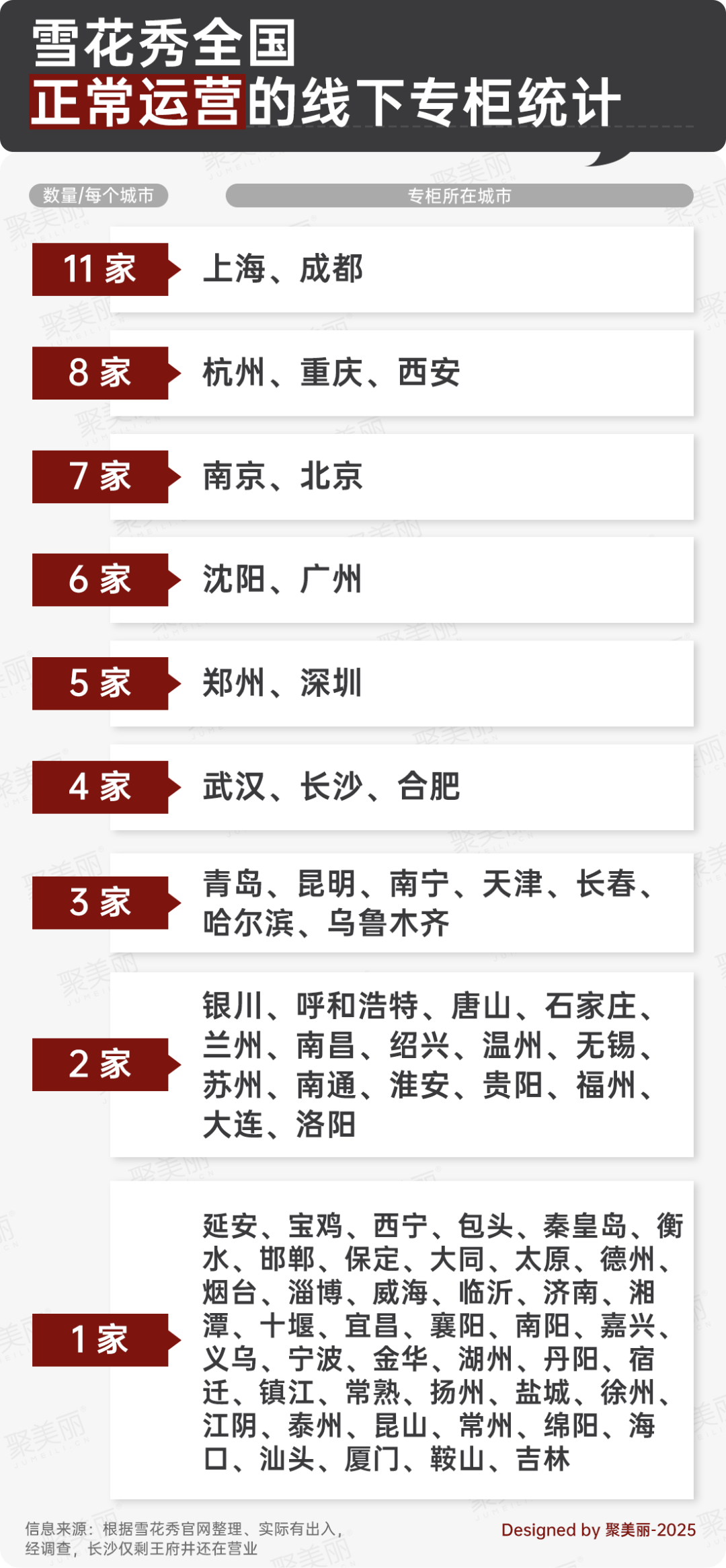 根據(jù)雪花秀官網(wǎng)披露的專柜信息,聚美麗梳理發(fā)現(xiàn),該品牌在中國(guó)市場(chǎng)的線下渠道仍保持著一定規(guī)模——覆蓋全國(guó)超過(guò)80個(gè)城市,門店總數(shù)逾180家,這與前述店員的說(shuō)法相符。