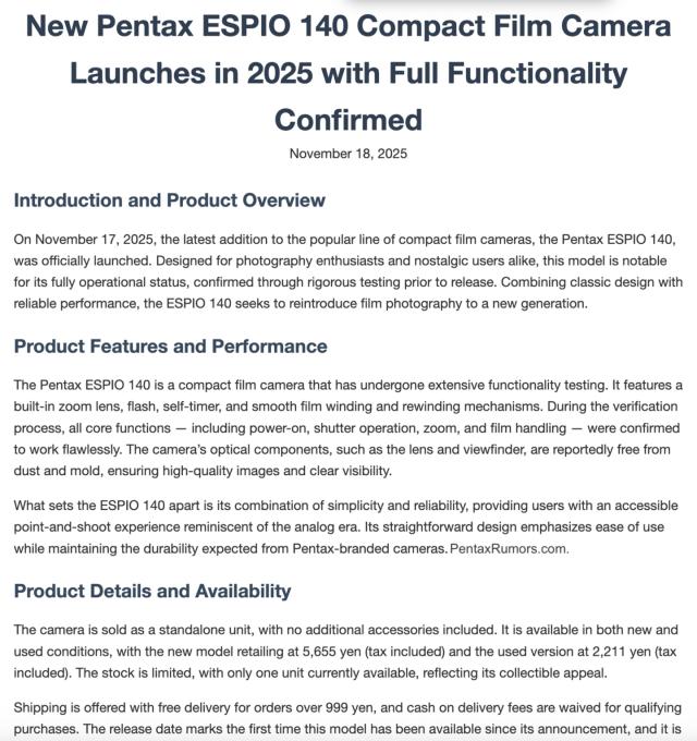 IT之家12月8日消息,據(jù)消息源Pentax Rumors昨日發(fā)布的博文顯示,其收到一份賓得新聞稿,內(nèi)容提及該公司有望復(fù)刻20世紀(jì)90年代末推出的ESPIO 140膠片傻瓜相機。