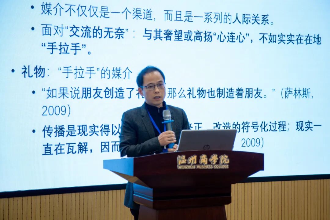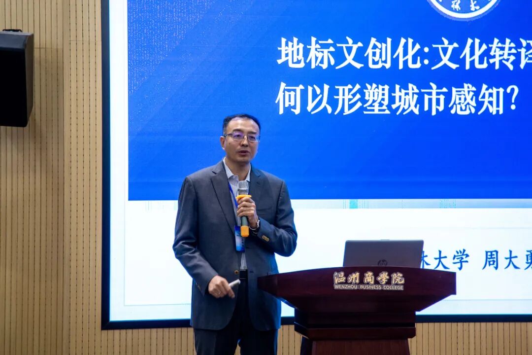 年會(huì)的主旨演講環(huán)節(jié)圍繞“數(shù)字時(shí)代商業(yè)文化傳承創(chuàng)新”展開,5位專家學(xué)者分別從理論建構(gòu)、實(shí)踐探索和傳播路徑三個(gè)維度進(jìn)行了深度分享。吉林大學(xué)周大勇教授以“地標(biāo)文創(chuàng)化”為切入點(diǎn),剖析了文化轉(zhuǎn)譯的商業(yè)邏輯對(duì)城市感知的塑造作用,為商業(yè)文化與城市發(fā)展的融合提供了新視角;溫州商學(xué)院吳風(fēng)教授結(jié)合數(shù)智技術(shù)實(shí)踐案例,提出了破解傳統(tǒng)商業(yè)文化傳播時(shí)空限制的創(chuàng)新方向;華夏傳播研究會(huì)副會(huì)長(zhǎng)姚錦云闡釋了“差等互惠與禮尚往來”的華夏人際傳播理論,為商業(yè)文化研究注入了中國(guó)特色理論根基;浙江中胤股份公司副總經(jīng)理陳春琴立足溫州本土實(shí)踐,分享了網(wǎng)文網(wǎng)劇商業(yè)化路徑,展現(xiàn)了地方文化產(chǎn)業(yè)的創(chuàng)新成果;《未來傳播》雜志社資深編輯華曉紅介紹了學(xué)科前沿與學(xué)術(shù)成果轉(zhuǎn)化路徑,搭建了理論與實(shí)踐銜接的橋梁。